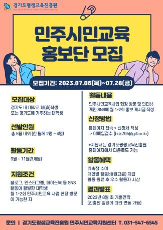 [한국뉴스타임=편집국] 경기도평생교육진흥원 민주시민교육지원센터가 2023년 ‘민주시민교육 인식개선 대학생 홍보단’ 참가자 총 20명을 모집한다.