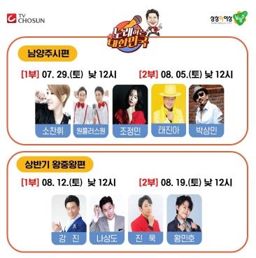[한국뉴스타임=편집국] TV조선 ‘노래하는 대한민국’ 남양주시편이 끼와 흥이 넘치는 참가자들이 많아 7월 29일, 8월 5일 각각 낮 12시에 두 편으로 나눠 방영되며, 상반기 왕중왕전은 8월 12일, 8월 19일 낮 12시에 방영될 예정이다.