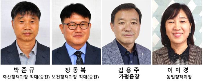 지난 21일 발표된 212명의 공무원 인사에 따른 임용장 교부식은 김용주 가평읍장, 이미경 농업정책과장, 장동복 보건정책과장 직무대리(승진), 박준규 축산정책과장 직무대리(승진) 등을 포함하여 승진 62명(승진후 전보 15명, 승진 후 보직 2명, 5급 2명, 6급 7명, 7급 21명, 8급 32명)과 전보 124명, 보직 16명(신규 9명, 부서내 보직변경 7명), 복직 6명, 신규 4명 등으로 109명이 임용장 교부 대상자이다.