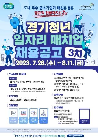 [한국뉴스타임=편집국] 경기도와 경기도일자리재단은 구직 청년과 우수 중소기업을 연결해 정규직 전환까지 지원하는 ‘경기청년 일자리 매치업’ 사업 3차 참여자를 26일부터 8월 11일까지 모집한다.