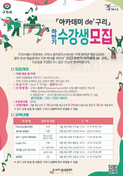[한국뉴스타임=편집국] 구리시는 오는 8월부터 구리시 음악창작소에서 구리시민의 잠재적 예술인 양성을 위한 “2023 하반기 아카데미 de’구리”를 시작한다.