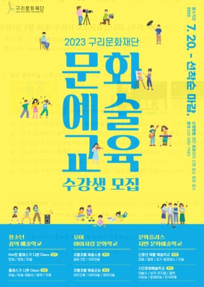 (재)구리문화재단은 7월 20일부터 정원 마감 시까지 '2023 문화예술교육 프로그램' 수강생을 모집하고 있다.