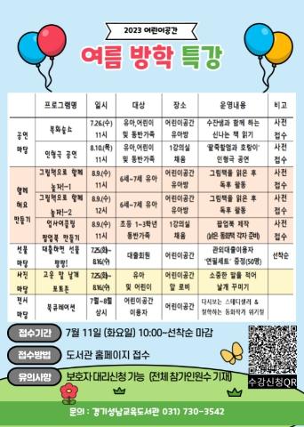 경기성남교육도서관(관장 여재구)이 다음달 16일까지 유아와 어린이를 대상으로 ‘여름방학 특별행사’를 운영한다.