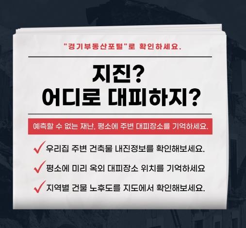 [한국뉴스타임=편집국] 경기도가 부동산 정보 누리집 ‘경기부동산포털’을 통해 건축물의 내진 정보와 노후도, 지진 대피장소(옥외대피소) 등을 제공한다며, 적극적인 활용을 당부했다.