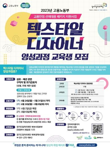 [한국뉴스타임=편집국] 경기도와 경기도일자리재단이 경기북부 섬유산업의 인력난 해소를 위해 다음달 8일까지 ‘텍스타일 디자이너 양성과정’ 2기 교육생을 모집한다.