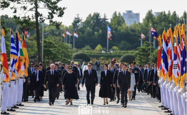 [한국뉴스타임=편집국] 윤석열 대통령 부부는 7월 27일 오후 부산 유엔기념공원을 찾아 데임 신디 키로 뉴질랜드 총독 부부, 자비에 베텔 룩셈부르크 총리 등 유엔 참전국 정부대표단과 함께 유엔기념공원 내 상징구역에 있는 룩셈부르크 국기, 뉴질랜드 기념비, 영국군 전사자 묘역 및 유엔군 위령탑을 참배했다.