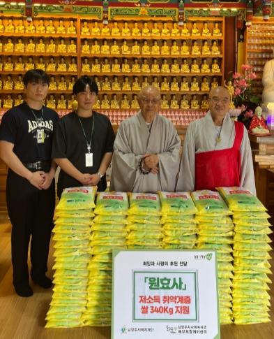 [한국뉴스타임=편집국] 남양주시 별내면 소재 원효사는 지난 27일 북부권역 저소득 취약계층을 위해 쌀 340kg을 남양주시사회복지관 북부희망케어센터에 전달했다.