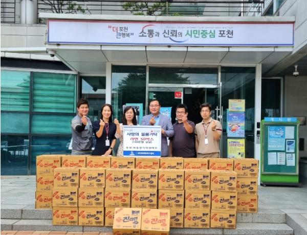 [한국뉴스타임=편집국] 포천시 선단동행정복지센터는 지난 28일 ㈜동양식자재마트에서 전달한 라면 50박스의 기탁식을 진행했다.
