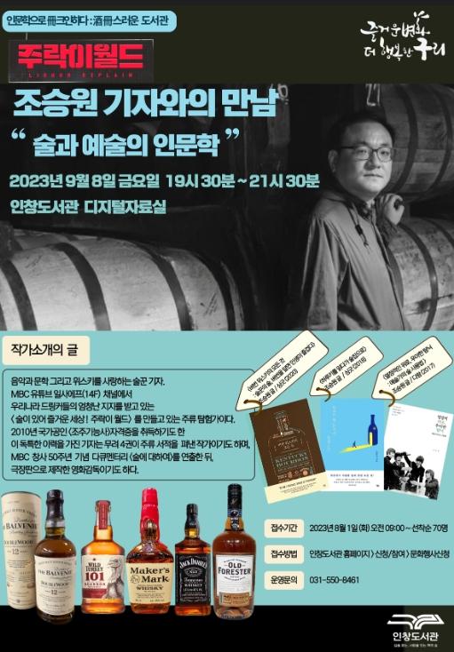 이번 특강은 ‘낙낙(樂樂)한 도서관, 인문학으로 책(冊)크인하다’라는 테마로 운영 중인 인창도서관 하반기 인문학의 세 번째 강좌이다. 자타공인 미주가(美酒家)이자 술과 예술에 대한 해박한 지식을 갖고 있는 조승원 기자가 그의 저서인 ‘하루키를 읽다가 술집으로’를 중심으로 영화같은 삶을 살았던 예술가들과 그 예술가들이 사랑했던 술과 음악에 대한 흥미로운 이야기를 들려줄 예정이다.