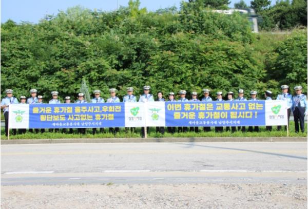 이날 행사에는 나용자 대장을 비롯한 각 지구대 대장 및 대원 50여 명이 참여해 ▲딱 반 잔도 음주운전입니다 절대 안돼요! ▲이번 휴가철은 교통사고 없는 즐거운 휴가철이 됩시다! ▲잠깐의 졸음운전 영원한 작별인사 등 휴가철 운전자가 주의를 기울일 수 있는 문구를 선정해 캠페인을 진행했다.