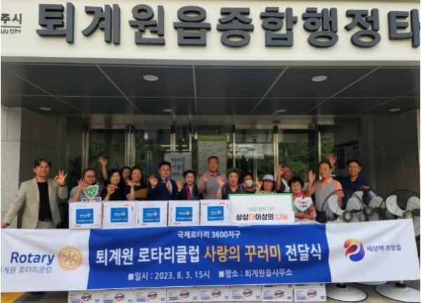 이날 퇴계원로타리클럽은 대형 선풍기 3대, 라면 100박스(총 2,000개) 등 200만 원 상당의 물품을 기탁했으며, 지역의 어르신 및 어려운 이웃들이 시원한 여름을 보낼 수 있도록 대형 선풍기는 퇴계원읍 게이트볼협회에, 라면은 저소득 가정에 전달될 예정이다.