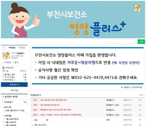 부친시보건소는 비대면 교육방식으로 전환된 이후, 온라인에 ‘부천시 영양플러스 카페’를 개설해 온라인 영양교육을 진행하고 있다. 부천시보건소는 개발한 영양교육자료를 사업 참여자에게 우편으로 배부하고, 참여자들은 교육자료를 수행한 후 결과를 온라인 카페에 게시하여 공유하는 방식이다.