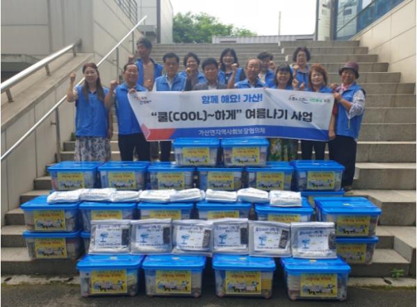지역사회보장협의체 위원들은 쿨매트와 쌀, 라면, 치약, 비누 등 12종의 다양한 식료품과 생필품이 담긴 꾸러미를 직접 만들어 나눠주었다.