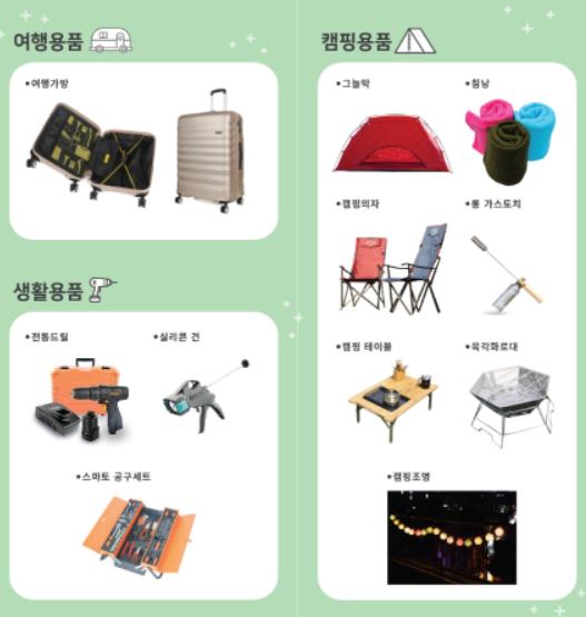 공유물품 대여서비스 품목은 여행용가방, 그늘막텐트(매트포함), 침낭, 캠핑테이블 및 의자, 육각화로대, 오덕테이블, 롱가스토치, 캠핑조명, 전동드릴, 공구세트 등이며 대여기간은 최대 20일이다.