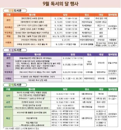 백경현 구리시장은 “9월 독서의 달 행사를 통해 책과 도서관에 대한 지역주민들의 관심을 유도하고 독서문화를 정착시키는 계기를 만들 것”이라며, “가족이 함께 도서관을 방문하여 책 읽기 좋은 계절을 만끽해 보길 바란다.”라고 전했다.