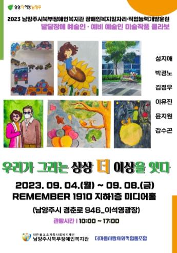 이번 전시회는 9월 4일부터 8일까지 5일간 남양주시 금곡동에 소재한 REMEMBER 1910 지하1층 미디어홀에서 진행되며 ‘우리가 그리는 상상 더 이상을 잇다’ 라는 주제로 남양주시청과 남양주시북부장애인복지관을 전경으로 하는 수채화와 캐리커쳐, 보석십자수, 아크릴화 등 약 30~35점의 작품이 전시된다.