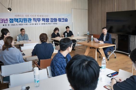 이날 워크숍은 신규 정책지원관들을 대상으로 실무에 초점을 맞춘 교육을 실시해 의정활동 지원 역량을 강화하고자 마련됐으며 의장과의 간담회, 정책지원관 실무 교육 순으로 진행됐다.