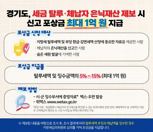 [한국뉴스타임=편집국] 경기도가 탈세 신고포상금을 최대 1억 원까지 지급하는 ‘지방세 탈루 세액·체납자 은닉재산 민간인 신고포상제’를 시행하고 있다며 도민들의 관심과 제보를 요청했다.
