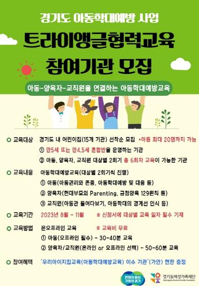 경기도가 추진하는 ‘경기도 아동학대예방 사업’은 2022년부터 경기도여성가족재단에 위탁 운영하고 있으며 도민 대상으로 추진하는 아동 학대 예방 교육은 크게 ▲우리아이지킴이 교육 ▲트라이앵글협력교육 2가지다.