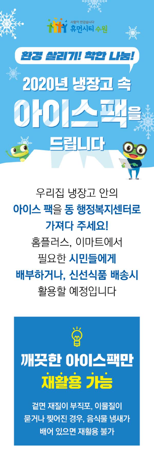 올해 사업은 9월까지 수원시 전역에서 진행된다. 수원시는 지난 7월부터 44개 동 행정복지센터와 공동주택 8개 단지에서 아이스팩을 수거하고 있다. 깨끗한 아이스팩만 재활용할 수 있다.