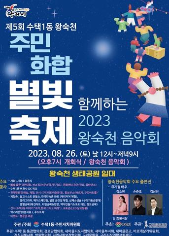 [한국뉴스타임=편집국] 구리시 수택1동 행정복지센터는 주민자치위원회 주관으로 오는 8월 26일(토) 12시에 왕숙천 생태공원에서 '제5회 수택1동 왕숙천 주민화합 별빛 축제'를 개최한다.