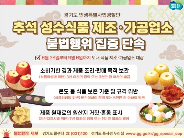 [한국뉴스타임=편집국] 경기도 특별사법경찰단이 8월 28일부터 9월 8일까지 추석 명절 선물?제수용 식품의 안전을 선제적으로 강화하기 위해 제조·가공업소 360개소를 집중 단속한다.