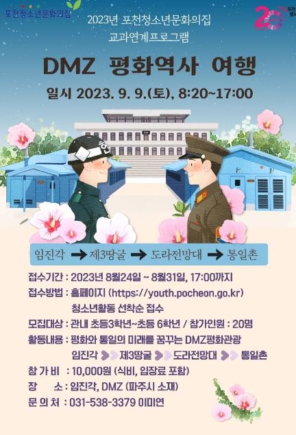 포천시)는 오는 8월 24일부터 31일까지 관내 청소년을 대상으로 평화에 대한 이해를 높이고, 올바른 역사의식을 함양하고자 교과연계프로그램 ‘DMZ 평화역사 여행’ 참가자를 모집한다.