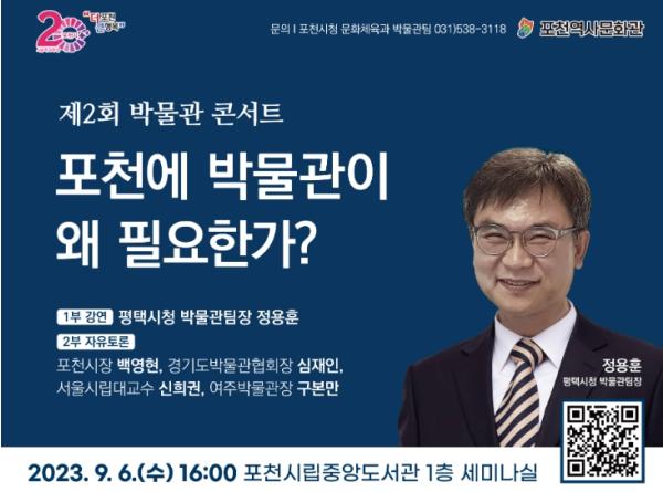 박물관 콘서트는 ‘포천에 박물관이 왜 필요한가?’를 주제로 2021년 문화체육관광부가 주관하는 ‘공립박물관 설립 사전 타당성 평가’를 통과한 평택시의 정용훈 박물관팀장을 초청해 시립박물관 건립에 대한 필요성을 확인하고 지자체의 박물관 운용 경험을 전달받고자 마련했다.