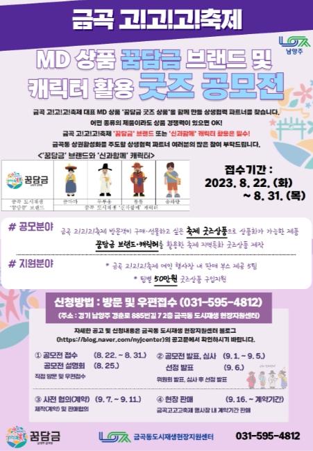 남양주시 임선영 도시재생과장은 “금곡동의 역사와 문화 정체성을 바탕으로 한 금곡 고고고축제의 대표 굿즈 상품으로 '꿈담금 브랜드'와 '신과함께 캐릭터'를 활용해 상품경쟁력을 갖춘 지역특화 굿즈 상품을 육성하고자 한다”라며“공모전에 많은 관심과 적극적인 참여를 부탁드린다.”라고 전했다.