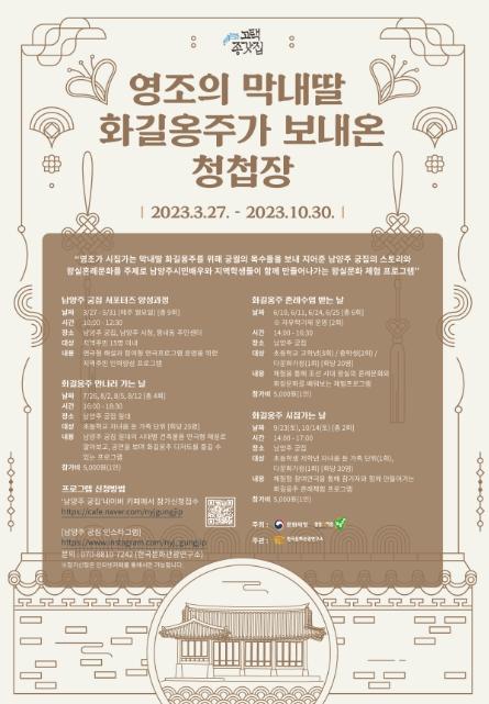 앞서 2차례 진행된‘화길옹주 만나러 가는 날’에서는 전통 공예품 만들기, 전통차 맛보기, 나만의 인형 만들기 등 체험 프로그램이 성황리에 진행됐으며, 마지막 프로그램인‘화길옹주 시집가는 날’에서는 참여연극을 통해 참가자와 함께 만들어가는 혼례 체험이 진행될 예정이다.