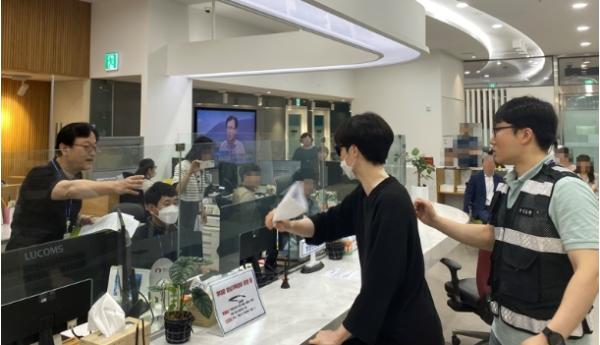 열린민원실 직원들은 특이민원 응대 지침에 따라 ▲민원인 진정 유도 ▲상급자의 적극 개입 ▲사전고지 후 휴대용 영상 촬영장비로 현장 녹화 ▲비상벨 작동(112 종합상황실 연결) 및 청원경찰 호출 ▲피해공무원 및 방문 민원인 보호 ▲가해 민원인 제압 ▲경찰 인계 순으로 전개했다.
