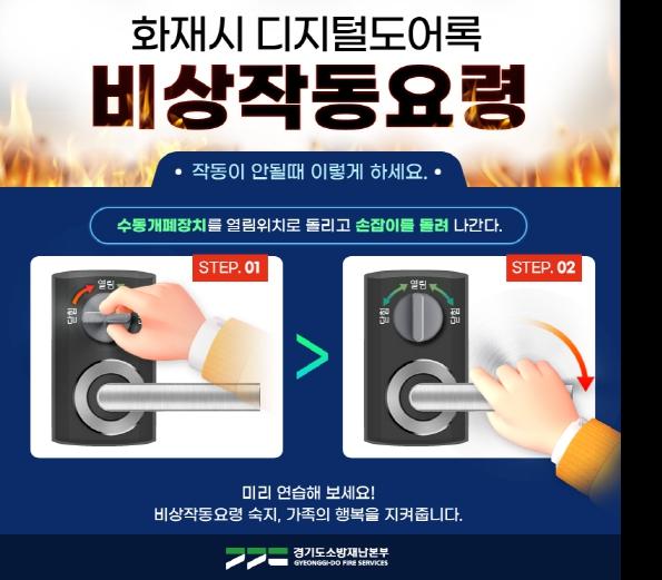 경기소방재난본부는 화재 발생 시 무엇보다 중요한 것은 신속한 대피라며 평소 가족 구성원 모두가 자기 집 도어록의 수동 개방 요령을 숙지해야 한다고 강조했다.