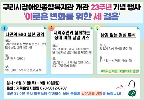 [한국뉴스타임=편집국] 구리시는 구리시장애인종합복지관에서 개관 23주년을 맞아 오는 8월 31일부터 9월 10일까지 기념행사를 진행한다고 밝혔다.