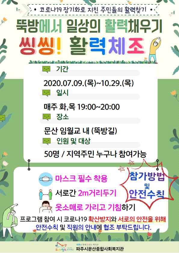 ‘씽씽! 활력체조’는 코로나19 장기화 속 심신이 지친 시민들의 건강과 활력을 되찾기 위해 시작하는 건강체조 프로그램이다. 앞으로 2개월 간 매주 화요일과 목요일 19시부터 20시까지 1시간 동안 진행되며 파주시민 누구나 무료로 참여가 가능하다.
