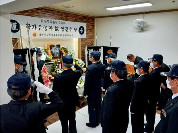 [한국뉴스타임=편집국] 남양주시는 올해부터 국가유공자 장례 선양을 지원하고 있는 가운데, 지난 28일 무공훈장(화랑)을 수훈한 국가유공자 고(故) 임진수님 빈소(호평동 백련장)에서 무공수훈자회 국가유공자 장례선양단의 장례 의식이 거행됐다.