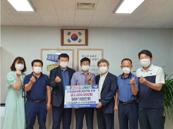[KNT한국뉴스타임] 남양주시 금곡양정행정복지센터(센터장 이영재)는 10일 관내 저소득 가정 아동의 돌봄 프로그램을 지원하기 위하여 철마기업인회(회장 심성택) 소속기업인 ㈜산수유케미컬(대표 최영채)와 ㈜아림금속(대표 양길순) 에서 300만원을 남부희망케어센터에 전달했다고 밝혔다.