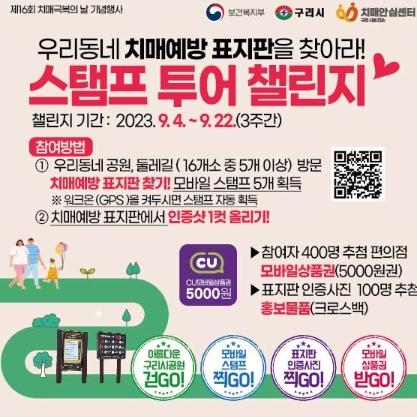 지정된 스탬프 존은 구리시 관내 시민 이용도가 높은 공원 등 14개소이며, 이곳에는 ‘기억력 테스트 놀이판’과‘치매 예방 3·3·3 안내 표지판’이 설치되어 있다. 시는 이 중 5개 이상의 스탬프를 획득한 시민 중 400명을 추첨해 편의점 모바일 상품권을 제공할 예정이다. 또한 치매 예방 표지판과 함께 인증샷을 게시한 사람 중 100명을 추첨해 실종 예방 홍보물품(미니크로스백)도 제공한다.