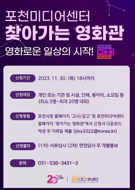 [한국뉴스타임=편집국] 포천미디어센터는 오는 11월 30일까지 ‘2023 찾아가는 영화관’ 신청 접수를 받는다고 밝혔다.