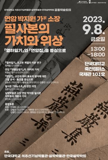 [한국뉴스타임=편집국] 경기문화재단 실학박물관은 오는 9월 8일 오후 1시, 단국대학교 국제관에서 단국대학교 석주선기념박물관, 한국실학학회와 공동으로 ‘연암 박지원 가(家) 소장 필사본의 가치와 위상’ 학술대회를 개최한다.
