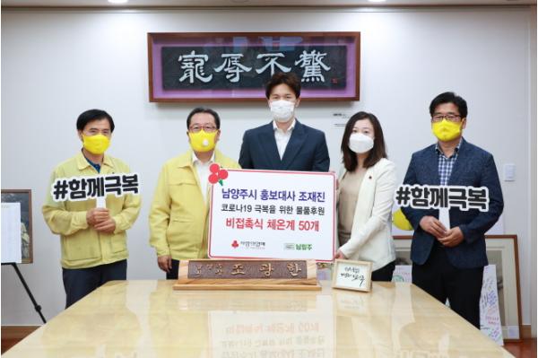 [KNT한국뉴스타임] 남양주시 홍보대사 조재진은 10일 코로나19 극복을 위해 접촉식·비접촉식 모두 가능한 듀얼 체온계 50개(600만원 상당)를 경기 사회복지공동모금회에 전달했다.
