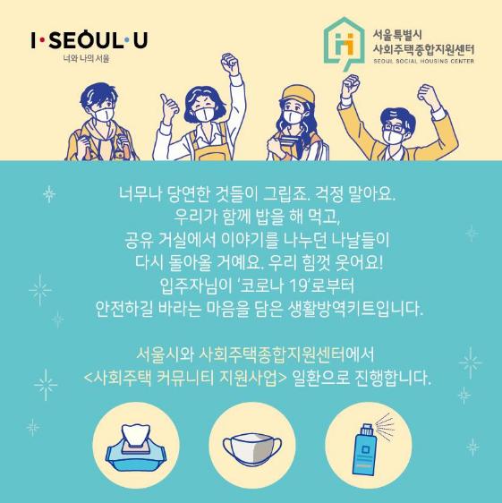 [KNT한국뉴스타임] 서울시는 사회주택종합지원센터와 함께 코로나 19 감염증 예방을 위해 서울시 사회주택 전세대에 생활방역키트「희망백신」배포를 시작한다고 밝혔다.