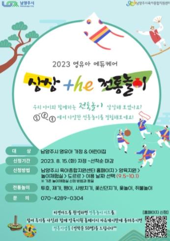 이번 행사는 2023년 시와 육아종합지원센터에서 추진하고 있는 ‘영유아 에듀케어 프로그램 보급_상상 the 전통놀이’사업의 일환으로, 추석을 맞아 영유아 가정과 관내 어린이집에서 누구나 참여할 수 있는 체험 행사로 진행된다.
