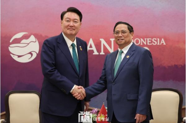 [한국뉴스타임=편집국] 아세안 관련 정상회의 참석을 위해 인도네시아 자카르타를 방문 중인 윤석열 대통령은 오늘(현지시간, 9. 6, 수) 오후 '팜 밍 찡(Pham Minh Chinh)'베트남 총리와 양자회담을 가졌다.