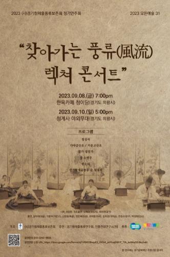 (사)경기향제줄풍류보존회의 '찾아가는 풍류(風流) 렉쳐 콘서트'는 과거 조선시대 선비들의 소통의 장이었던 풍류방의 분위기를 현대에 재현하고자 기획된 음악회로, 9월 8일 오후 7시에 한옥카페 청이당에서, 9월 10일 오후 5시에는 청계사에서 개최한다. 인터넷을 통해 사전예약 가능하며, 선착순 50명에게는 음료를 증정한다.