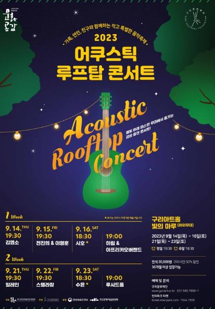 [한국뉴스타임=편집국] 구리문화재단은 9월 14일부터 23일까지 2주간 총 6회에 걸쳐 가을밤 감성을 채워줄 특별한 음악 축제인 '2023 어쿠스틱 루프탑 콘서트'를 구리아트홀 빛의 마루(야외무대)에서 개최한다.