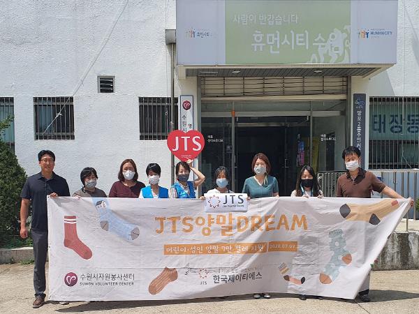㈔한국제이티에스는 지난 9일 오후 2시 수원시자원봉사센터 영통분소를 방문해 양말 7만 6000켤레의 후원 물품을 전달했다.