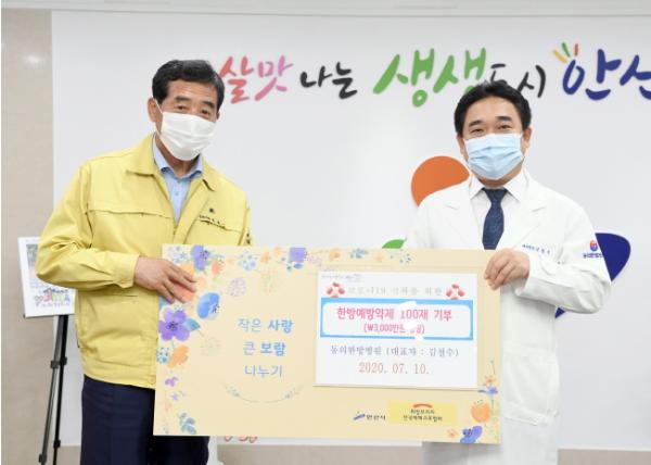안산시(시장 윤화섭)는 동의한방병원으로부터 코로나바이러스감염증-19(코로나19) 확산 방지와 어르신들의 건강 증진을 위해 사용해 달라며 청폐배독탕 50재와 옥병풍산 50재 등 한방예방약제 100재(3천만 원 상당)를 기탁 받았다고 13일 밝혔다.