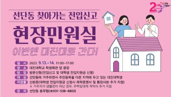 선단동은 오는 13일부터 14일까지 이틀간 대진대학교 학생회관 앞에서 오전 11시부터 오후 5시까지 ‘찾아가는 전입신고 현장민원실’을 설치해 전입신고를 받고 다른 시·군에서 전입한 대진대학생에 대해 대학생 전입 지원금 신청도 함께 진행할 계획이다.