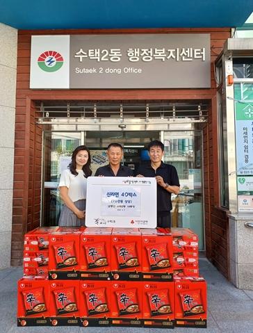 [한국뉴스타임=편집국] 구리시 수택2동 행정복지센터는 지난 7일 수택2동 김종근 18통장으로부터 추석 명절을 앞두고 이웃돕기 신라면(20입) 40박스를 후원받았다.