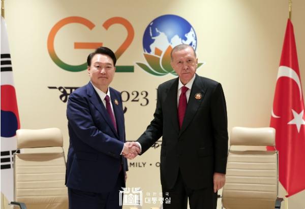 [한국뉴스타임=편집국] G20 정상회의 참석차 인도 뉴델리를 방문 중인 윤석열 대통령은 오늘(현지시간 9. 9, 토) 오후 '레젭 타입 에르도안(Recep Tayyip Erdo?an)' 튀르키예 대통령과 정상회담을 가졌다.
